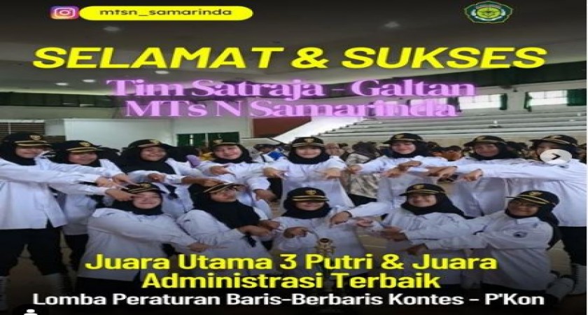 Alhamdulillah. Selamat dan sukses untuk ananda semua yang tergabung dalam tim Satraja - Galtan MTsN Samarinda yang telah berhasil meraih Juara Utama 3 Putri dan Juara Administrasi Terbaik pada Lomba Peraturan Baris Berbaris Kontes - P'Kon yang berlangsung pada Sabtu, 4 Maret 2023 di SMP Plus Melati Samarinda.