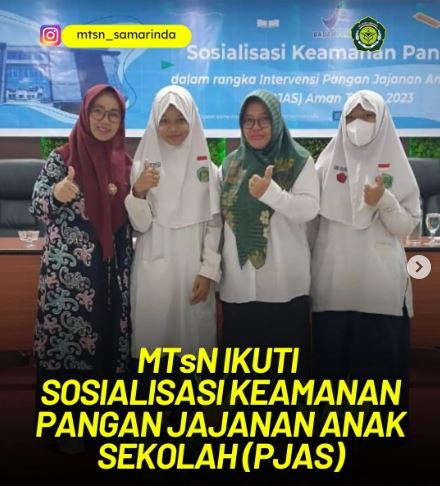 Pembina UKS MTs N Samarinda, Ibu Lily Nurhuratin, Pengelola Kantin, Ibu Norsaedah dan 2 siswi dari MTs N Samarinda, yakni ananda Rifatul Athiyyah dan Kania Asa Fathinah menghadiri sosialisasi dari BPOM Prif Samarinda terkait Keamanan Pangan Jajanan Anak Sekolah (PJAS).